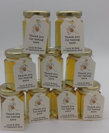 We commission Wedding Favours, Beautifully presented 2oz (56g) pocket size hexagon jars. can be found in the honey shop page